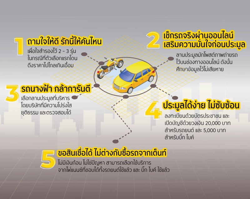 5. ขอสินเชื่อได้ ไม่ต่างกับซื้อรถจากเต็นท์ หากไม่มีเงินก้อนเพื่อซื้อรถจากลานประมูลก็ไม่ใช่ปัญหา เพราะปัจจุบันได้มีการให้บริการสินเชื่อที่ลานประมูลแล้ว ทั้งสินเชื่อรถยนต์ใช้แล้ว และรถบิ๊ก ไบค์ ใช้แล้ว นอกจากนี้ สำหรับใครที่อยากมั่นใจว่ามีวงเงินเพียงพอก่อนไปประมูลรถ เหมือนพกเงินสดติดกระเป๋าไปด้วย ก็สามารถเช็กวงเงินประเมินสินเชื่อเบื้องต้นกับผู้ให้บริการสินเชื่อได้ สำหรับ กรุงศรี ออโต้ มีให้บริการ กรุงศรี ออโต้ พร้อมสตาร์ท ที่รู้ผลประเมินวงเงินภายใน 3 นาที โดยผู้สนใจสามารถสแกน QR Code ที่ตัวรถ หรือคลิก “สนใจสินเชื่อ” ในรายการรถประมูลที่ปรากฏอยู่บนเว็บไซต์ ของบริษัทประมูลก็ได้