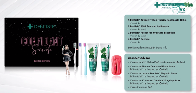 – ชุดยาสีฟันแปรงสีฟัน Limited Edition จำนวนจำกัด ใน 1 ชุดประกอบด้วยชุดแปรงสีฟันพกพา (Pocket Pro) ยาสีฟัน DENTISTE’ Anticavity Max Fluoride แปรงสีฟัน และสแตนดี้อะคริลิกลิซ่า