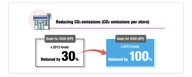 ออกมาตรการลด CO2 ในกระบวนการธุรกิจ เช่น ใช้ระบบทำความเย็นประหยัดไฟ เปลี่ยนมาใช้ไฟ LED ใช้พลังงานหมุนเวียน พัฒนาโมเดลร้านค้าที่เป็นมิตรกับสิ่งแวดล้อม รถขนส่งสินค้า ให้ใช้พลังงานไบโอดีเซล บี 5 รถยนต์ไฟฟ้า ยางที่เป็นมิตรกับสิ่งแวดล้อม และวางแผนเส้นทางการจัดส่งให้มีประสิทธิภาพ