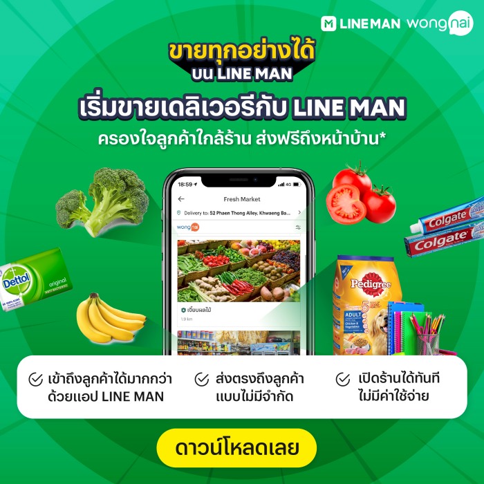 สำหรับร้านค้าที่สนใจร่วม LINE MAN ขายทุกอย่าง สามารถสมัครได้ฟรี ไม่คิดค่า GP ส่งฟรีทุกร้าน ประเดิมดึง 3 ตลาดใหญ่ ได้แก่ ตลาด อ.ต.ก. ตลาดสามย่าน และตลาดยิ่งเจริญขึ้นแพลตฟอร์ม ช่วยให้ผู้บริโภคเข้าถึงวัตถุดิบที่สดใหม่และหลากหลายได้สะดวกมากขึ้นในช่วงล็อกดาวน์ โดยลูกค้าจะได้ค่าส่งฟรีทุกออร์เดอร์ตามระยะทางที่กำหนด ระหว่างวันที่ 2 ส.ค. – 10 ต.ค. 64 สำหรับร้านหรือตลาดที่สนใจสามารถสมัครได้แล้วผ่านเว็บไซต์ https://bit.ly/2WV39IH