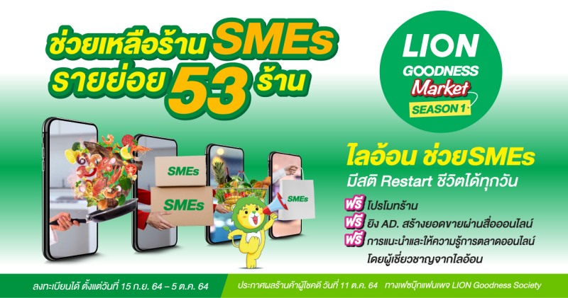 บริษัท ไลอ้อน (ประเทศไทย) จำกัด ผู้ผลิตและจำหน่ายสินค้าอุปโภคบริโภคเพื่อคนไทย มุ่งมั่นดำเนินธุรกิจพัฒนาสินค้านวัตกรรม เพื่อสุขภาวะที่ดีของผู้บริโภคอย่างต่อเนื่อง ตามแนวทางการนำความดีสู่สังคม สร้างสุขภาวะที่ดีสู่ผู้บริโภค ได้จัด “โครงการ LION Goodness Market – Season 1” เพื่อร่วมเป็นส่วนหนึ่งในการขับเคลื่อนธุรกิจ SMEs 53 ร้านค้า ให้เดินหน้าต่อไปได้ในช่วงวิกฤตโควิด-19 โดยโครงการดังกล่าว เป็นการมอบสิทธิประโยชน์ต่าง ๆ ไม่ว่าจะเป็น การช่วยโปรโมทร้านค้า ช่วยโฆษณาสร้างยอดขายผ่านสื่อออนไลน์ รวมไปถึงให้คำแนะนำการทำตลาดออนไลน์ที่ร้านค้าสามารถนำไปใช้ได้จริงทั้งก่อนและหลังเข้าร่วมโครงการ