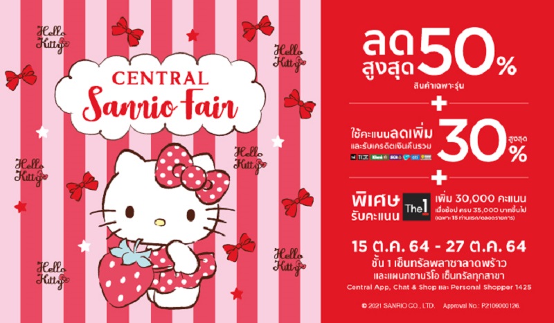 ห้างเซ็นทรัล จัดงาน “Central Sanrio Fair 2021” (เซ็นทรัล ซานริโอ แฟร์ 2021) มหกรรมสุดคิวต์แห่งปีที่แฟนซานริโอรอคอย ชวนนักช้อปคาวาอิ มาสัมผัสความน่ารักของเหล่าคาแรกเตอร์ขวัญใจทุกคน ยกขบวนมาให้ช้อปฟินพร้อมรับโปรโมชั่นสุดคุ้ม! อาทิ ลดสูงสุด 50% ใช้คะแนนลดเพิ่มและรับเครดิตเงินคืนสูงสุด 30% พิเศษ! รับคะแนนเดอะวัน เพิ่ม 30,000 คะแนน (เมื่อช้อปตามเงื่อนไข) พร้อมสิทธิพิเศษอื่นๆอีกมากมาย พบกัน ณ บริเวณพื้นที่โปรโมชั่น ชั้น 1 เซ็นทรัลพลาซาลาดพร้าว ระหว่างวันที่ 15 – 27 ต.ค. 2564 และช้อปเพิ่มเติมได้ที่แผนกซานริโอ ห้างเซ็นทรัลทุกสาขา ระหว่างวันที่ 15 ต.ค. – 15 พ.ย. 2564 พร้อมกันนี้ ยังสามารถช้อปสะดวกกับหลากหลายช่องทางช้อปปิ้งทั้ง Central App, Central Chat & Shop, Personal Shopper On Demand โทร.1425 ช้อปกับผู้ช่วยช้อปส่วนตัว และช้อปผ่านเฟซบุ๊กเพจ Central Department Store ได้อีกด้วย
