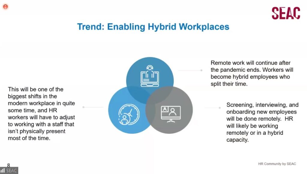 ปี 2022 รูปแบบของการทำงานจากที่บ้านผสานกับการทำงานที่ออฟฟิศ หรือ Hybrid Workplace เป็นเทรนด์ที่มาแรงต่อเนื่อง เพราะถึงแม้สถานการณ์โควิด-19 จะกลับมาดีขึ้น แต่ผลสำรวจพบว่า องค์กรมากกว่าครึ่งมีแผนจะทำ Hybrid Workplace โดยให้พนักงานมีการทำงานแบบ Virtual จากที่ไหนก็ได้ในบางวันของสัปดาห์และเข้ามาประชุมที่บริษัทแบบ Face to Face ในบางส่วน ดังนั้น HR ต้องเตรียมพร้อม ปรับนโยบายให้สอดรับกับรูปแบบการทำงานใหม่มากขึ้น ไม่ว่าจะเป็น การเข้าออกงาน การทำ Employee Communication และการ Manage Performance ที่ต้องมองในมิติใหม่ ไม่ใช่แค่วัดผลจากเวลาเข้าออกงานแบบเดิมๆ
