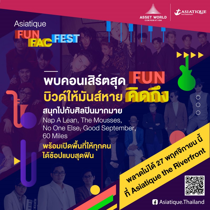 “เอเชียทีค เดอะ ริเวอร์ฟร้อนท์” ธุรกิจรีเทลในกลุ่มบริษัทแอสเสท เวิรด์ คอร์ป จำกัด (มหาชน) หรือ AWC ขานรับนโยบายเปิดประเทศ รับนักท่องเที่ยวทั้งชาวไทย และต่างชาติ พร้อมจัดคอนเสิร์ต ASIATIQUE FunFacFest ในวันเสาร์ที่ 27 พฤศจิกายน 2564 ที่ Town Square ตั้งแต่เวลา 15.00 – 22.00 น.