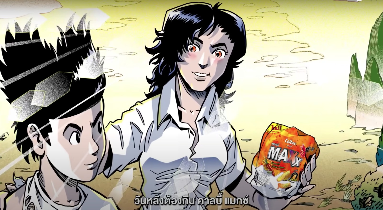 นอกจากนี้ ยังส่งภาพยนตร์โฆษณา ที่โดดเด่นด้วยลายเส้นการ์ตูนสไตล์ญี่ปุ่น เล่าเรื่องราวของวัยรุ่นที่เดี๋ยวนี้มีเรื่องให้เครียดขึ้นเยอะ แต่เมื่อมีซูเปอร์ฮีโร่ ที่ใช้ท่าไม้ตาย กระสุนราวตากผ้า ส่ง “Calbee Maxx” มาให้ชิม ความเครียดก็หายไปทันที! โดยตัวหนังยังขยี้ความเป็น “กุ้งเน้นๆ” และ การเคลือบซอสสวีทแอนด์สไปซี่ลงบนแท่งข้าวเกรียบกุ้ง
