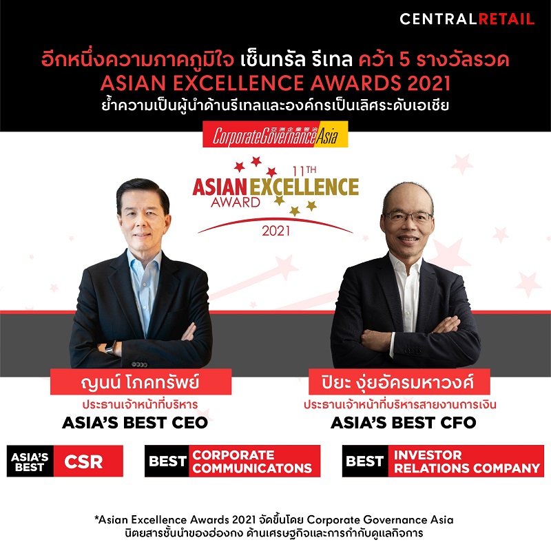 บริษัท เซ็นทรัล รีเทล คอร์ปอเรชั่น จำกัด (มหาชน) คว้า 5 รางวัล Asian Excellence Awards 2021 สะท้อนความเป็นผู้นำด้านรีเทลควบคู่กับการบริหารจัดการตามหลักธรรมมาภิบาลที่ ดีเยี่ยมในระดับสากล โดย 5 รางวัลประกอบไปด้วยรางวัล “ซีอีโอยอดเยี่ยมแห่งเอเชีย” (Asia’s Best CEO) มอบให้แก่นายญนน์ โภคทรัพย์ รางวัล “ซีเอฟโอยอดเยี่ยมแห่งเอเชีย” (Asia’s Best CFO) มอบให้แก่ นายปิยะ งุ่ยอัครมหาวงศ์ รางวัล “ซีเอสอาร์ยอดเยี่ยมแห่งเอเชีย” (Asia’s Best CSR) รางวัล “บริษัทนักลงทุนสัมพันธ์ยอดเยี่ยม” (Best Investor Relations Company) และรางวัล “ทีมสื่อสารองค์กรยอดเยี่ยม” (Best Corporate Communications Team)