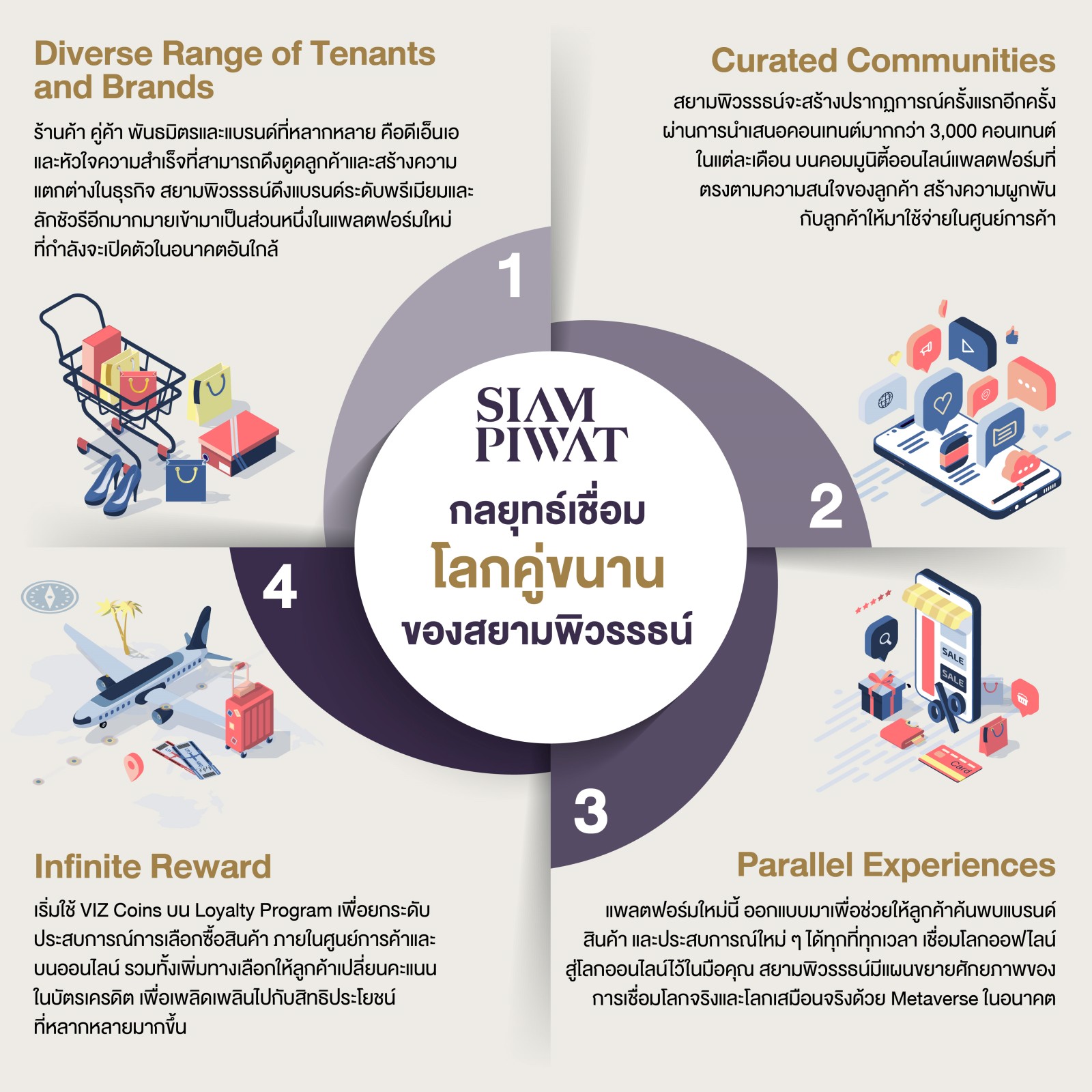 1. ผนึกร้านค้า คู่ค้า พันธมิตร และแบรนด์ที่หลากหลาย สร้างความตื่นตาและดึงดูดใจลูกค้าที่มีกำลังซื้อมากกกว่าที่เคย โดยในช่วงเดือนเมษายนที่ผ่านมา สยามพิวรรธ์มีการเปิดตัว Ultimate Chat & Shop ซึ่งเป็นช่วงโควิด-19 ระลอก 4 ซึ่งพบว่าลูกค้ามียอดใช้จ่ายออนไลน์สูงกว่ายอดซื้อปกติในประเทศไทยโดยเฉลี่ยถึง 9-10 เท่า เนื่องจากลูกค้าสามารถช้อปปิ้งได้ทุกที่ทุกเวลา จึงมีแผนจะดึงแบรนด์และคู่ค้าระดับพรีเมียม รวมถึงลักชัวรีแบรนด์เข้ามาเป็นส่วนหนึ่งของแพลตฟอร์มใหม่เพิ่มขึ้น