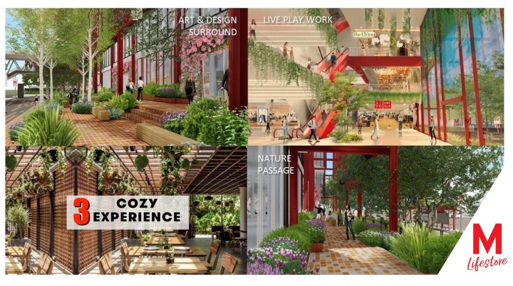 3.COZY EXPERIENCE ผสานความรื่นรมย์ของธรรมชาติเข้ากับไลฟ์สไตล์อย่างลงตัว มีความเป็นมิตรและอบอุ่น พร้อมเพิ่มความสนุกด้วยดีไซน์กราฟฟิคสีสันสดใสตกแต่งทั่วทั้งศูนย์ฯ และห้างฯทำให้การมาใช้ชีวิตมีความสนุกสนาน