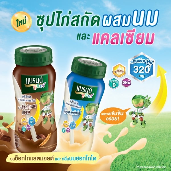 เพื่อเป็นอีกหนึ่งตัวช่วยให้กับคุณแม่ แบรนด์จูเนียร์ ขอแนะนำผลิตภัณฑ์ใหม่ ‘แบรนด์จูเนียร์ซุปไก่สกัดผสมนมและแคลเซียม” ด้วยคุณประโยชน์จากนม และแคลเซียมสูงถึง 320 มิลลิกรัม ช่วยเสริมสร้างกระดูก และฟันให้แข็งแรง อีกทั้งยังมีวิตามินดีที่มีส่วนช่วยในการดูดซึมแคลเซียมและฟอสฟอรัสช่วยเสริมการเจริญเติบโตด้านกายภาพของเด็กอีกด้วย พร้อมด้วยประโยชน์ของซุปไก่สกัด ดีเอชเอ และวิตามินบี 12 ที่มีส่วนช่วยบำรุงระบบประสาทและสมองให้เด็ก ๆ พร้อมสำหรับการเรียนรู้ในแต่ละวันได้อย่างเต็มที่ โดย ‘แบรนด์จูเนียร์ซุปไก่สกัดผสมนมและแคลเซียม’ มี 2 รสชาติ ให้เลือก ดังนี้