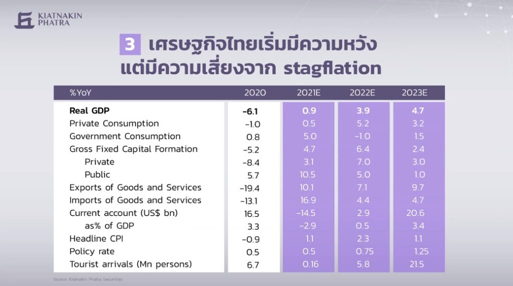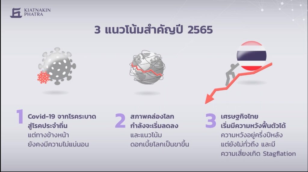3.แนวโน้มเศรษฐกิจไทยเริ่มฟื้นตัวได้ โดยคาดการณ์การเติบโตทางเศรษฐกิจ (GDP) จะโตในระดับ 3.9% โดยเครื่องยนต์หลักในการขับเคลื่อนมาจาก 2 ตัว คือ 1.การกลับสู่ภาวะปกติของอุปสงค์ภายในประเทศ คือการบริโภคและการลงทุน ซึ่งจะกลับเข้าสู่ภาวะปกติได้ สิ่งสำคัญต้องไม่เกิดมาตรการเข้มที่ทำให้กิจกรรมทางเศรษฐกิจหยุดชะงัก และโอไมครอนเป็นเวฟสุดท้าย และ 2.จำนวนนักท่องเที่ยวน่าจะทยอยกลับสู่ภาวะปกติในช่วงครึ่งปีหลังของปีนี้ โดยเชื่อว่าถ้าโอไมครอนเป็นเวฟสุดท้าย นักท่องเที่ยวจะเดินทางกลับสู่ภาวะปกติในครึ่งปีหลัง โดยคาดว่าจะเข้ามาประมาณ 5.8 ล้านคน