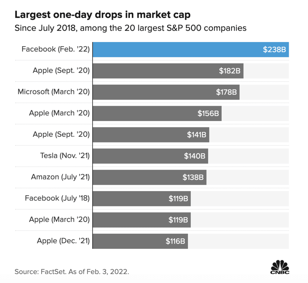 ในส่วนของ Meta หรือว่า Facebbok นั้น ทำให้หุ้นของเฟซบุ๊กกลายเป็นหุ้นที่ “ตกลงในวันเดียว มูลค่าลดลงมากที่สุดในประวัติศาสตร์” เลยทีเดียว