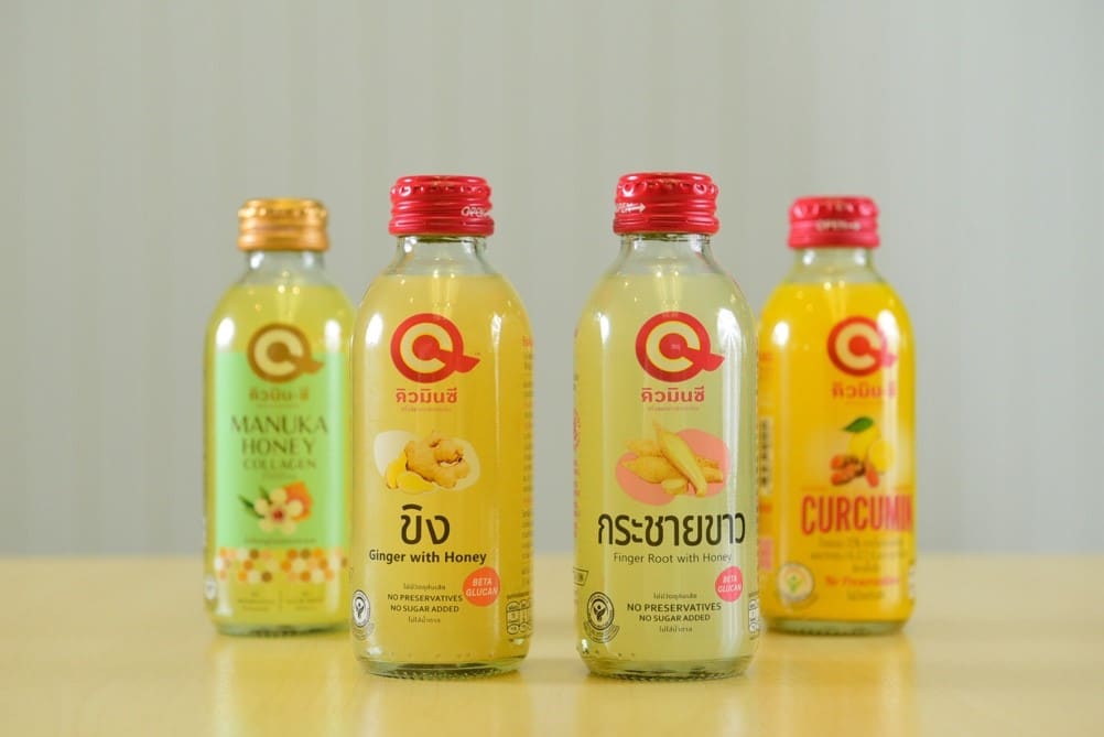 1. คิวมินซี เครื่องดื่มขิงสกัดเข้มข้นผสมน้ำผึ้ง (Ginger with Honey) เป็นครั้งแรกของไทยกับเครื่องดื่มขิงสกัดที่มาในรูปแบบขวดพร้อมดื่ม และ “ขิง” ขึ้นชื่อว่าเป็นอีกหนึ่ง Superfood สมุนไพรระดับสากลที่มีงานวิจัยเผยแพร่อย่างกว้างขวางถึงสรรพคุณ ทั้งเบต้ากลูแคน ช่วยด้านภูมิคุ้มกันร่างกาย และป้องกันการติดเชื้อจากจุลชีพต่างๆ จึงได้รับการยอมรับด้านฤทธิ์ต้านการอักเสบ โดยใน 1 ขวดประกอบด้วย