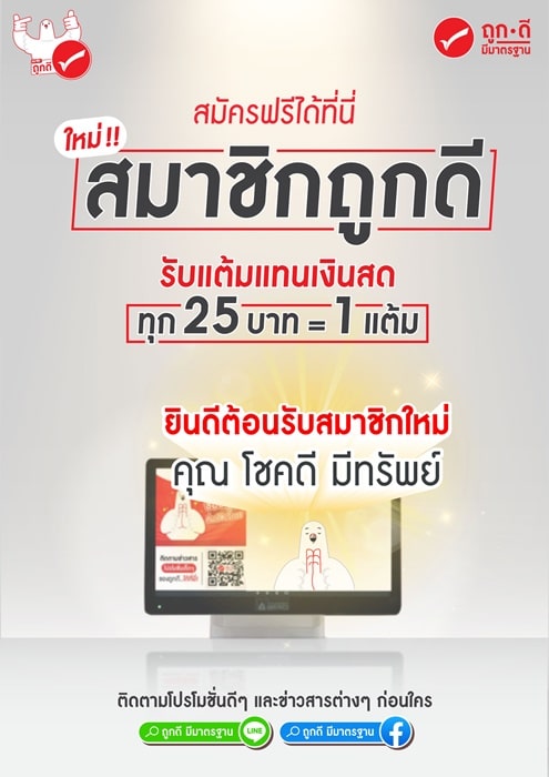ระบบสมาชิกถูกดี ถือเป็นเครื่องมือสำคัญในการสร้างฐานลูกค้าประจำให้กับพาร์ทเนอร์ โดยลูกค้าที่สนใจสมัครเป็นสมาชิก สามารถสมัครสมาชิกถูกดีได้ฟรี ที่ร้านถูกดี มีมาตรฐาน ทุกร้านค้าทั่วประเทศ และสามารถสะสมแต้ม เพื่อเอาไว้แลกแต้มแทนเงินสดที่ร้านถูกดี มีมาตรฐาน โดยทุกการใช้จ่าย 25 บาท ได้รับ 1 แต้ม ทุก 200 แต้ม มีค่าแทนเงินสด 10 บาท (*การใช้แต้มต้องเป็นไปตามเงื่อนไขที่บริษัทกำหนด) ระบบสะสมแต้มนี้นอกจากจะช่วยคืนกำไรให้ลูกค้าแล้ว ยังช่วยสร้างโอกาสในการเพิ่มยอดขายให้พาร์ทเนอร์ทุกคนอีกด้วย