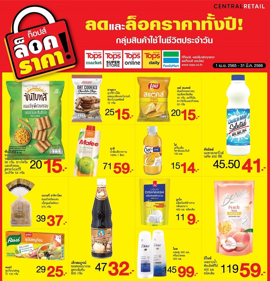 เนื่องจากพิษโควิดและสถานการณ์เศรษฐกิจโลกที่ได้ส่งผลกระทบต่อคนทั่วโลกและคนไทย ท็อปส์ (Tops) และ แฟมิลี่มาร์ท (FamilyMart) ซูเปอร์มาร์เก็ตชั้นนำ จึงผนึกผู้ผลิตสินค้า 58 แบรนด์ดัง จัดโครงการ “ท็อปส์ ล็อคราคา! ลดและล็อคราคาทั้งปี” ประกาศตรึงราคาสินค้าอุปโภค-บริโภคที่จำเป็นกว่า 190 รายการ ขายราคาเดิมยาว 1 ปี เริ่ม 1 เมษายน 2565 –31 มีนาคม 2566 ที่ ท็อปส์ มาร์เก็ต,ท็อปส์ ซูเปอร์สโตร์, ท็อปส์ เดลี่, แฟมิลี่มาร์ททุกสาขา และท็อปส์ออนไลน์