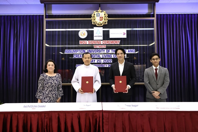 มหาวิทยาลัยอัสสัมชัญ วิทยาเขตหัวหมาก โดย ภราดา ดร. บัญชา แสงหิรัญ อธิการบดี มหาวิทยาลัยอัสสัมชัญ และ คุณพิชเยนทร์ หงษ์ภักดี ประธานกรรมการบริหาร บริษัท ครีเอทีฟ ดิจิทัล ลิฟวิ่ง จำกัด ร่วมด้วย ผศ.ดร.อุรีย์ เจื่ยสกุล คณบดีคณะบริหารธุรกิจและเศรษฐศาสตร์ มหาวิทยาลัยอัสสัมชัญ และ คุณอัมพรสักก์ อังคทะวานิช ประธานเจ้าหน้าที่บริหาร บริษัท ครีเอทีฟ ดิจิทัล ลิฟวิ่ง จำกัด