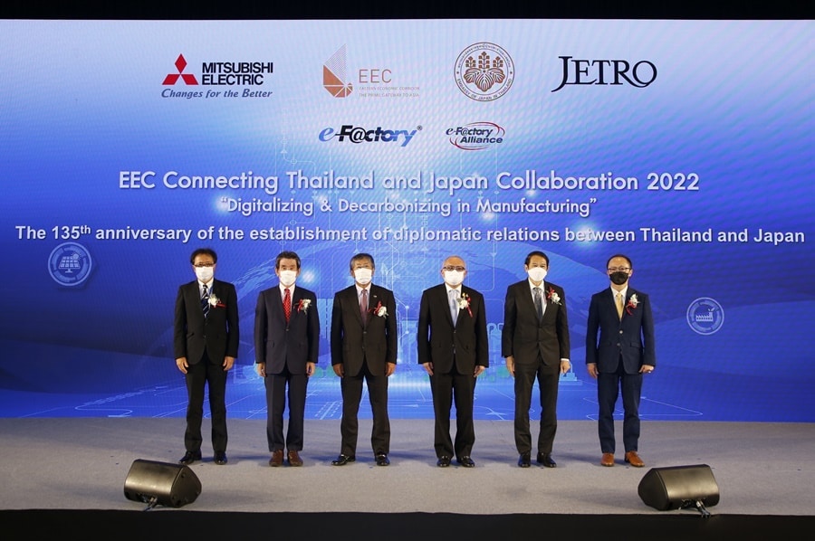 Mitsubishi Electric ร่วมกับ อีอีซี พร้อมทั้งพันธมิตรเครือข่าย Ecosystem ไทย-ญี่ปุ่น จัดงาน EEC Connecting Thailand and Japan Collaboration 2022 แถลงความสำเร็จจากการต่อยอดความร่วมมือเชื่อมโยงพันธมิตรกว่า 60 บริษัทในไทย และมากกว่า 1,000 บริษัททั่วโลก ถ่ายทอดความรู้และเทคโนโลยีชั้นสูง รวมทั้งแชร์ประสบการณ์จริงจากการใช้งาน เพื่อปลดล็อกภาคอุตสาหกรรมการผลิตของไทยให้เข้าสู่ระบบการผลิตอัตโนมัติ e-F@ctory (Industry 4.0 + 5G utilization) เดินหน้าพัฒนาสู่โรงงานอัจฉริยะกว่า 10,000 แห่ง พัฒนาทักษะบุคลากร 50,000 คน เกิดการลงทุนไม่น้อยกว่า 50,000 ล้านบาทใน 3 ปี ยกระดับอีอีซี สู่พื้นที่ลงทุนนวัตกรรมขั้นสูง เสริมความแข็งแกร่งทางเศรษฐกิจ เพิ่มรายได้ และคุณภาพชีวิตคนไทย พร้อมตั้งเป้าก้าวสู่ความเป็นกลางทางคาร์บอน Digitalizing and Decarbonizing เพื่อให้ธุรกิจเกิดการพัฒนาอย่างยั่งยืน และบรรลุเป้าความสำเร็จเชิงรูปธรรมตามนโยบาย Industry Thailand 4.0 ของรัฐบาลไทยได้เร็วขึ้น โดยมีบุคคลสำคัญทั้งจากภาครัฐและเอกชนเข้าร่วมงาน และออนไลน์รวมกว่า 500 ราย