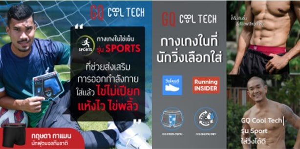 กฤษดา กาแมน นักฟุตบอลทีมชาติ ยังการันตีว่า “GQ Cool Tech™ รุ่น Sports เป็นกางเกงในที่ช่วยส่งเสริมการออกกำลังกาย ใส่เเล้วไข่ไม่เปียก แห้งไว ไข่พลิ้ว เย็นไข่ สบายข้างขา ไม่อับชื้น ไม่เหนียวเหนอะหนะ”