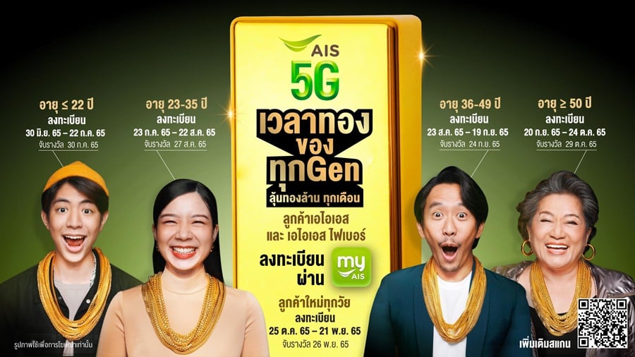 สำหรับแคมเปญ “เวลาทองของทุก GEN” เป็นแคมเปญขอบคุณลูกค้าครั้งใหญ่ของ AIS ที่มอบสิทธิพิเศษให้กับลูกค้า ระบบรายเดือน, ระบบเติมเงิน, ลูกค้า GOMO by AIS และ AIS Fibre ทั้งหมด มาร่วมลุ้นรางวัลทองคำมูลค่า 1ล้านบาท ตลอดช่วงเวลา 5 เดือน ตั้งแต่เดือน กรกฎาคม ถึง พฤศจิกายน 2565 รวมมูลค่าทั้งสิ้น 5 ล้านบาท