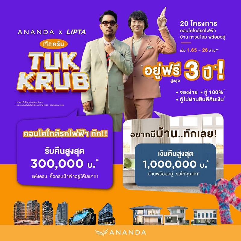 อนันดาฯ ส่งแคมเปญ โปรฯ แรง “อยู่ฟรีสูงสุด 3 ปี รับเงินคืนสูงสุด 1 ล้านบาท” จับมือ Lipta ปล่อยเพลง “อนันดา ทักครับ!!” พร้อมอยู่กว่า 20 โครงการ ตั้งแต่วันนี้ – 30 ก.ย.นี้ [PR]