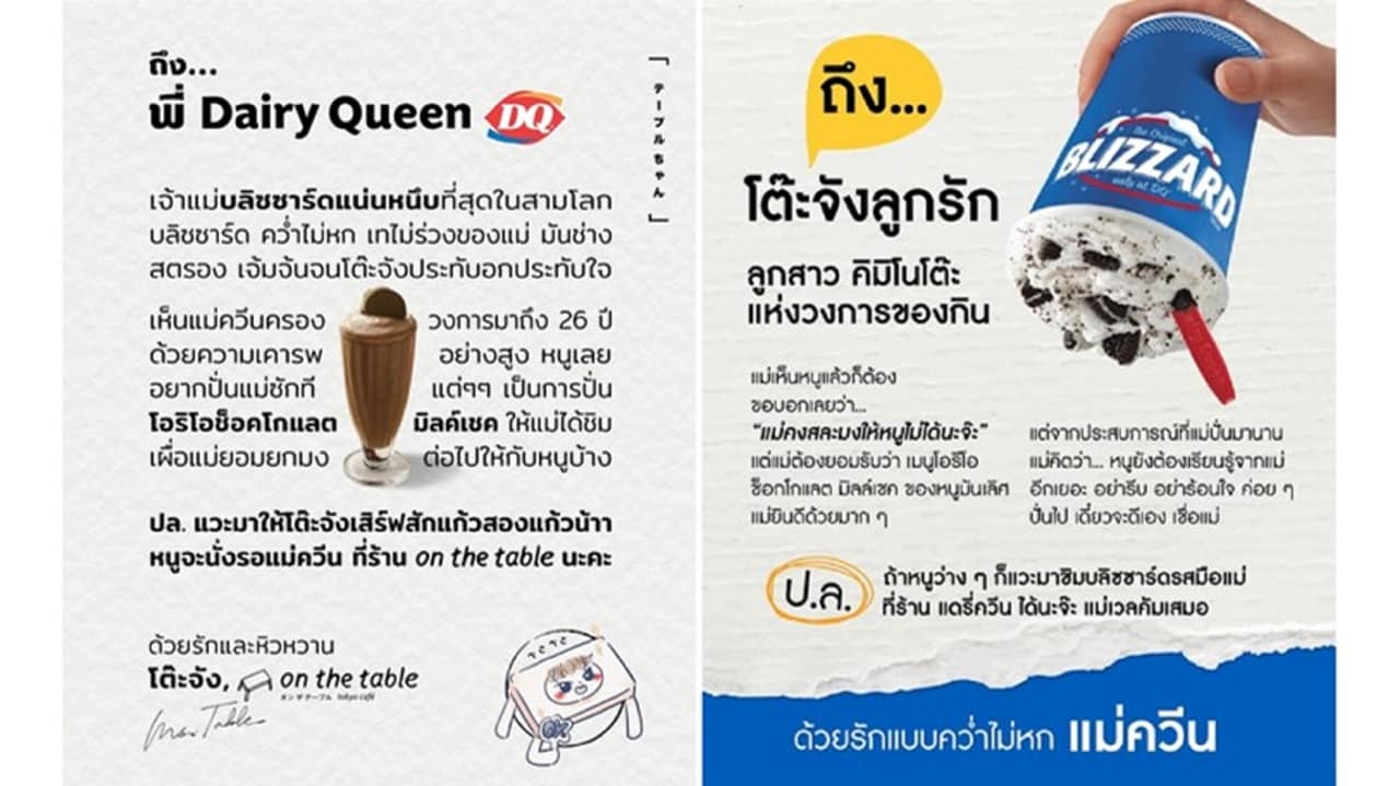 ร้านอาหาร On the Table สร้างกระแสหลังเปิดตัวแบรนด์มาสคอตน้องใหม่ ‘โต๊ะจัง’ ร่อนจดหมายหลายสิบฉบับส่งถึงร้านอาหารดังมากมายให้มาร่วมโต๊ะ ไม่ว่าจะเป็น Burger King, Dairy Queen, Swensen’s, KFC, LINE MAN, McDonald’s, แม่ประนอม, สุกี้ตี๋น้อย, MK และ Jones Salad