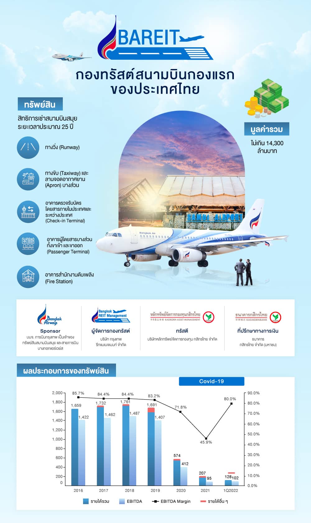 BAREIT จะเข้าลงทุนครั้งแรกในสิทธิการเช่าสนามบินสมุย ประกอบด้วย ทางวิ่ง ลานจอด และสิ่งปลูกสร้างที่ใช้ในการดำเนินกิจการสนามบิน เป็นระยะเวลาประมาณ 25 ปี นับจากวันที่กองทรัสต์คาดว่าจะเข้าลงทุนในทรัพย์สินครั้งแรก รวมมูลค่าทั้งสิ้นไม่เกิน 14,300 ล้านบาท โดยกองทรัสต์ฯ จะมีรายได้จากการปล่อยเช่า ให้กับบริษัทย่อยของ BA เป็นเวลา 25 ปี โดยประมาณการอัตราผลตอบแทนจ่ายให้แก่ผู้ถือหน่วยในปีแรก ประมาณ 8.09-8.95% ทั้งนี้ ขึ้นอยู่กับราคาสุดท้ายที่จะเข้าลงทุน (อ้างอิงประมาณการอัตราเงินจ่ายประโยชน์ตอบแทนของกองทรัสต์สำหรับช่วงเวลาประมาณการตั้งแต่วันที่ 1 สิงหาคม 2565 ถึง 31 กรกฎาคม 2566 สำหรับช่วงมูลค่าทรัพย์สินที่กองทรัสต์จะเข้าลงทุน ซึ่งแสดงไว้ในร่างหนังสือชี้ชวน)