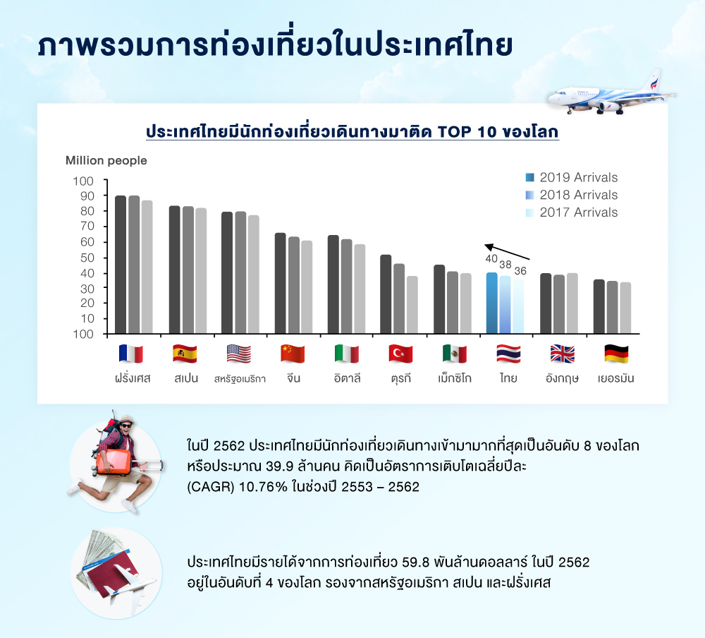แม้หลายคนกังวลเรื่อง COVID-19 ระลอกใหม่ แต่เห็นได้ว่ามาตรการต่าง ๆ ยังเดินหน้าต่อเพื่อขับเคลื่อนเศรษฐกิจในภาพรวม โดยเฉพาะด้านการเดินทางท่องเที่ยว ที่มีการเปิดประเทศอย่างเต็มรูปแบบ และผ่อนคลายเงื่อนไขเปิดรับชาวต่างชาติที่ต้องการเดินทางเข้าประเทศ ซึ่งเป็นปัจจัยสำคัญที่สนับสนุนให้ภาพรวมอุตสาหกรรมการท่องเที่ยวไทยฟื้นตัว ข้อมูลจากการท่องเที่ยวแห่งประเทศไทยคาดว่าในปี 2565 จะมีนักท่องเที่ยวต่างชาติเดินทางมาประเทศไทยเพิ่มขึ้นเป็น 7-10 ล้านคน