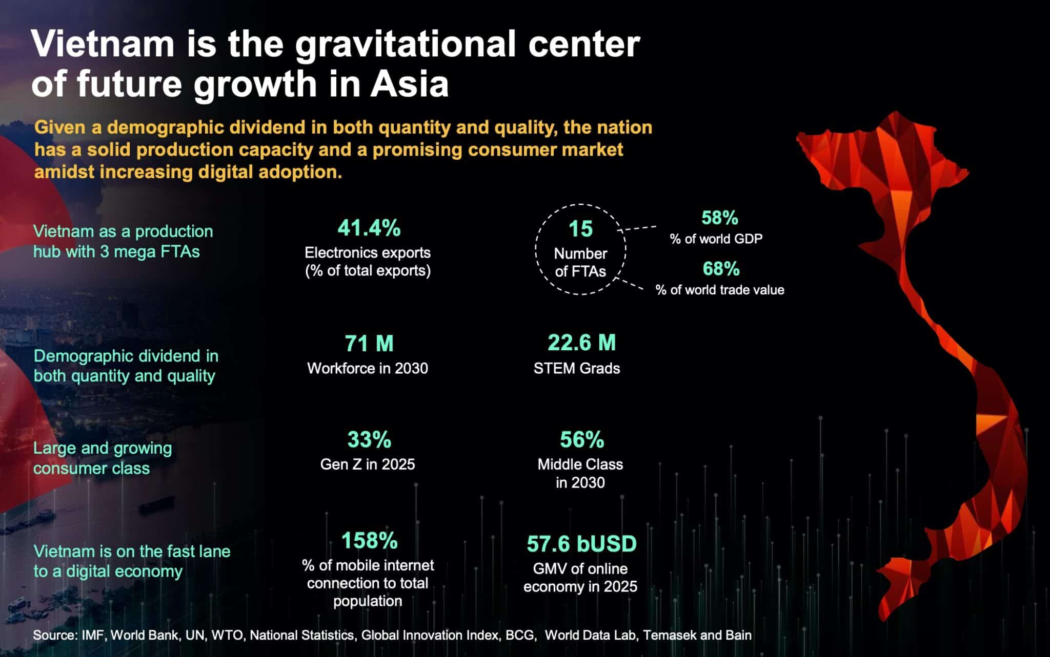 เวียดนามมีนโยบายของภาครัฐที่ส่งเสริมเป้าหมายในการเป็น “ศูนย์กลางด้านเทคโนโลยี” แห่งใหม่ของเอเชีย ในขณะที่มีประชากรกว่า 100 ล้านคน มีอายุเฉลี่ยค่อนข้างน้อย ส่วนมากอยู่ในวัยทำงาน มีการเติบโตของชนชั้นกลางอย่างมีนัยสำคัญ โดยเห็นได้จากอัตราการเติบโตของการอุปโภคบริโภคที่ 7% ใน 3 ปีข้างหน้า นอกจากนี้ยังเปิดกว้างต่อพฤติกรรมการใช้จ่ายทางดิจิทัล โดยพบว่าประชากรเวียดนามมากกว่า 50% ซื้อสินค้าออนไลน์