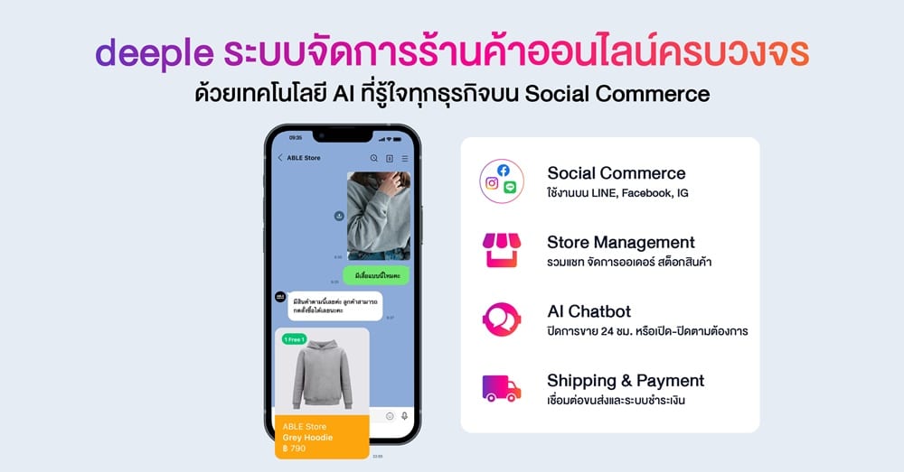 deeple ผู้ให้บริการระบบจัดการร้านค้าออนไลน์แบบครบวงจรสำหรับธุรกิจ Social commerce นำโดยนายกฤตธี ศิริสิทธิ์ ประธานเจ้าหน้าที่บริหาร บริษัท ดีเปิ้ล จำกัด ขยายฟีเจอร์ให้สามารถรองรับการทำธุรกิจออนไลน์ที่หลากหลายมากขึ้น ด้วยเทคโนโลยี AI ที่ล้ำกว่าเดิม ให้ผู้ใช้งานสามารถออกแบบการใช้งานระบบจัดการร้านค้าและแชทบอทได้ตรงใจ เปิดกว้างให้ทุกรูปแบบธุรกิจโดยไม่จำกัดเพียงธุรกิจสินค้าทั่วไปหรือสินค้าสำเร็จรูปเท่านั้น พร้อมรองรับการเติบโตและช่วยแก้ไขปัญหาอย่างตรงจุดให้ธุรกิจออนไลน์ทุกประเภทและทุกขนาด ตั้งแต่การจัดการออเดอร์ จัดการระบบหลังร้าน วิเคราะห์ฐานข้อมูลลูกค้าเพื่อช่วยเพิ่มยอดขาย ไปจนถึงการให้บริการแชทบอทที่ช่วยปิดการขายได้อย่างสมบูรณ์ และยังสามารถเชื่อมต่อได้ทั้งบน LINE Facebook และ Instagram แบบครบจบในที่เดียว ช่วยอำนวยความสะดวกในการทำธุรกิจออนไลน์ และเสริมกำลังให้ธุรกิจประสบความสำเร็จได้มากขึ้น