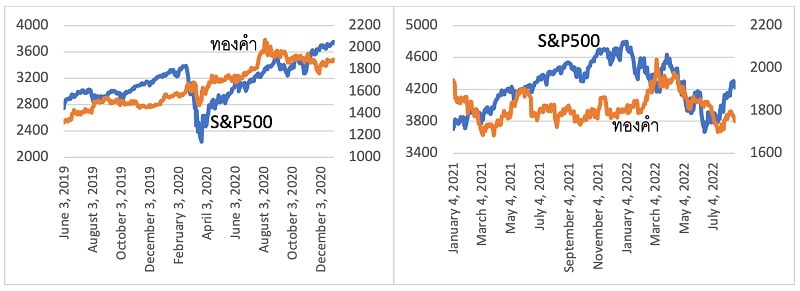 ที่มา: ผู้เขียนคำนวณจากข้อมูลราคา S&P500 (แกนซ้าย) จาก Investing.com และ ข้อมูลราคาทองคำ (แกนขวา) จาก World Gold Council