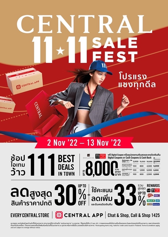แคมเปญ “11.11 Sale Fest โปรแรง แซงทุกดีล” ทางห้างจัดงานตั้งแต่ 2 พ.ย. 65 – 13 พ.ย. 65 มอบดีลสุดคุ้มค่า และกล้าการันตีของแท้ 100% พร้อมแจกโค้ดส่วนลดแบบไม่ต้องกลัวหมด มาพร้อมบริการออมนิชาแนลที่สร้างประสบการณ์ช้อปแตกต่างจากเจ้าอื่น อย่างการช้อปผ่าน Central App และ www.central.co.th แล้วเลือกมารับของที่ห้างได้ใน 1 ชม. หรือ ส่งทันใจใน 3 ชม. กับบริการ 3 Hours Delivery ตอบโจทย์ลูกค้าที่อยากได้ของเร็ว มั่นใจได้ว่า ‘ตรงปก’ เพราะการันตีจากแบรนด์เซ็นทรัล-โรบินสันที่ลูกค้าวางใจมานาน