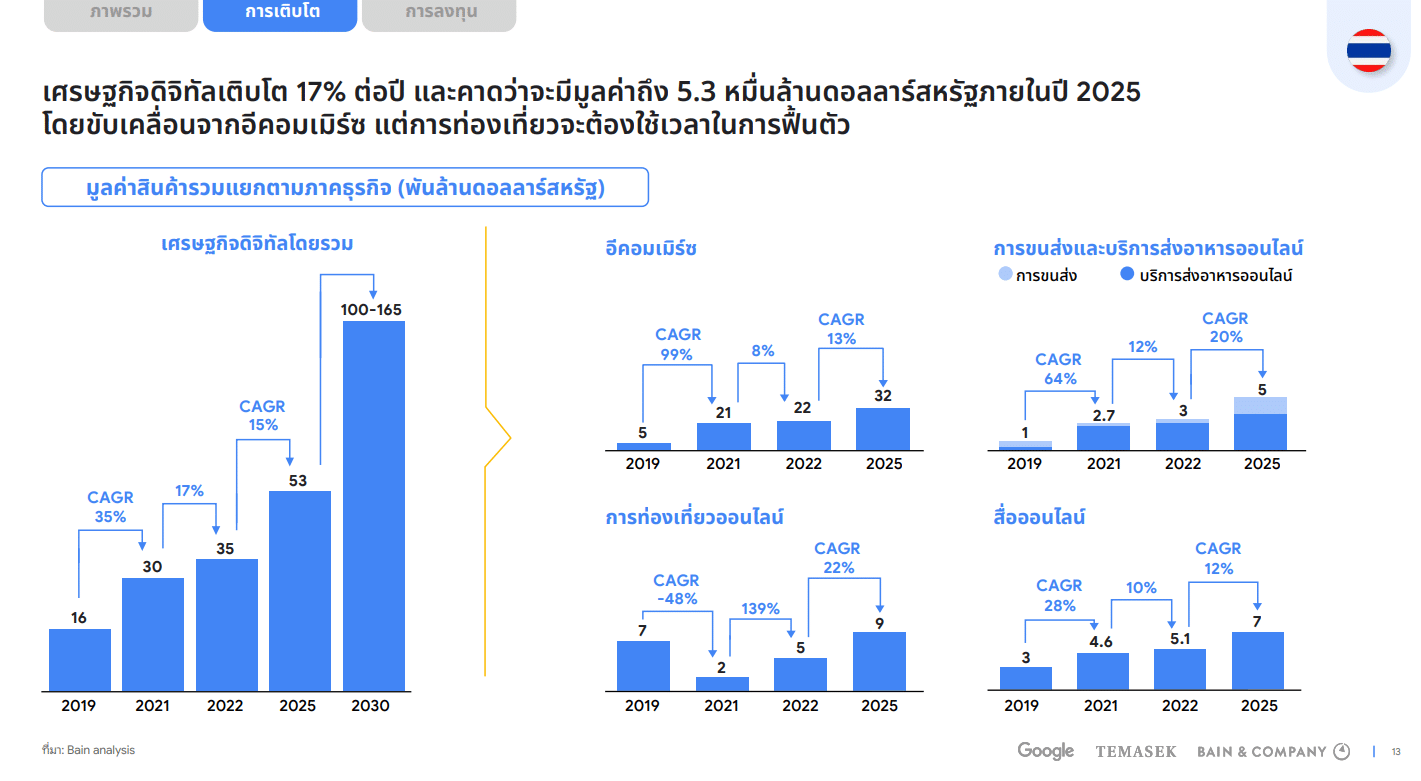 สำหรับประเทศไทย ผลสำรวจ e-Conomy SEA Report 2022 คาดว่าเศรษฐกิจดิจิทัลในปีนี้ จะมีมูลค่า GMV สูงถึง 3.5 หมื่นล้านเหรียญสหรัฐ โดยมีอัตราการเติบโตอยู่ที่ 17% เมื่อเทียบกับปีที่ผ่านมา (ปี 2021 มีมูลค่าอยู่ที่ 3 หมื่นล้านเหรียญสหรัฐ) และคาดว่าในปี 2025 มูลค่าสินค้ารวมเศรษฐกิจดิจิทัลของไทยจะแตะ 5.3 หมื่นล้านเหรียญสหรัฐ หรือคิดเป็นอัตราการเติบโตเฉลี่ยต่อปีที่ 15% โดยพบว่า อีคอมเมิร์ซ, บริการส่งอาหารออนไลน์ และการซื้อของสดออนไลน์ เป็น 3 บริการดิจิทัลที่มีอัตราการใช้บริการสูงที่สุดในกลุ่มคนไทยที่อยู่ในเขตเมือง