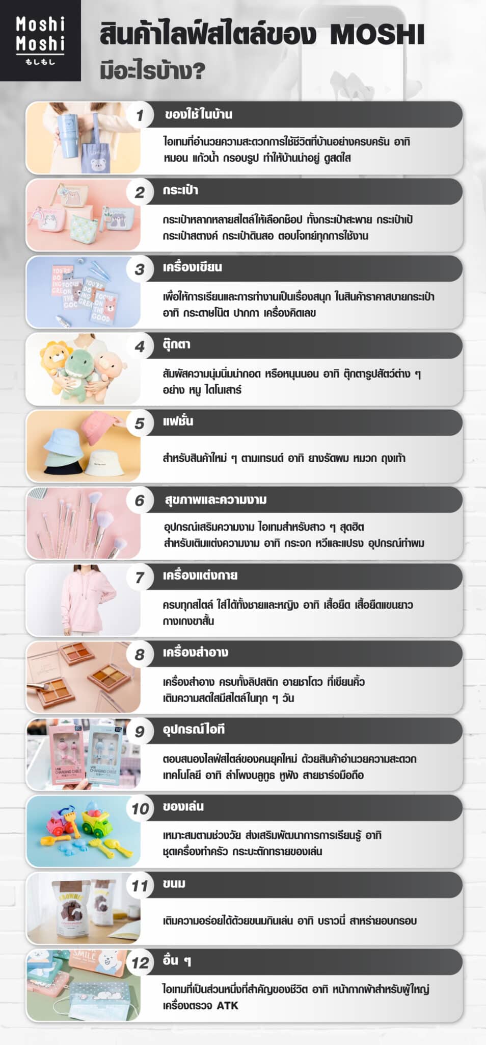 หลายคนอาจเข้าใจว่า MOSHI เป็นแบรนด์ต่างชาติ ด้วยรูปแบบสินค้า การจัดร้าน หรือแม้แต่ชื่อบริษัท แต่ MOSHI เป็นบริษัทสัญชาติไทยแท้ที่ก่อตั้งขึ้นในปี 2559 และสร้างการเติบโตอย่างก้าวกระโดด จาก 4 สาขาในปีแรก โดยมี Market Share ที่ 3% เพิ่มขึ้นเป็น 37.6% ในปี 2564 ภายใต้ช่องทางจำหน่ายที่หลากหลาย ทั้งเครือข่ายสาขาของบริษัท จำนวน 100 สาขา, Online Platform และ Pop-up Store ในห้างสรรพสินค้าชั้นนำทั่วประเทศ ภายใต้แรงขับเคลื่อนที่ว่า “เราจะพัฒนาผลิตภัณฑ์ โดยเน้นคุณภาพ สรรสร้างการออกแบบที่เป็นเลิศในราคาที่แข่งขันได้ และคงไว้ซึ่งความนิยมของผู้บริโภคเพื่อให้ผลิตภัณฑ์ของ Moshi Moshi เป็นส่วนหนึ่งในชีวิตประจำวันของลูกค้า”