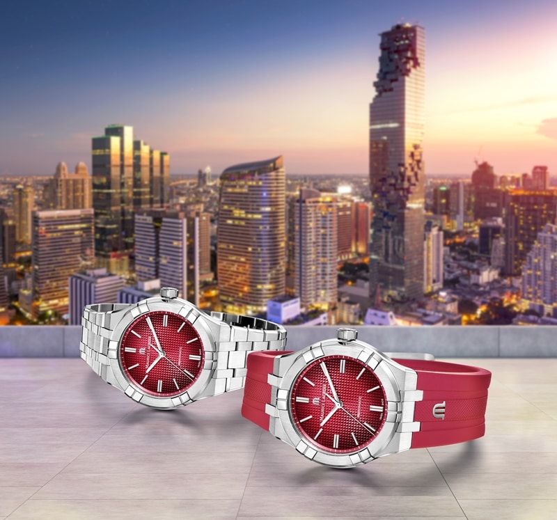 นาฬิกา MAURICE LACROIX รุ่น AIKON Club Thailand Limited Edition โดดเด่นด้วยหน้าปัดขนาด 42mm. สีแดงเบอร์กันดี และยังสัมพันธ์กับหนึ่งในสีของธงชาติประจำประเทศไทย ที่มีความหมายถึงความเป็นชาติ ที่มีผู้คนมากมายมารวมตัวกันอยู่ พร้อมแพทเทริ์นแบบคลูเดอปารีส์ อันเป็นหนึ่งในเอกลักษณ์ของนาฬิการุ่น AIKON เสริมความพิเศษ ด้วยเอฟเฟคท์แบบสโม๊ค ซึ่งไม่เคยผลิตมาก่อนในนาฬิกาจาก MAURICE LACROIX โดยจะมีลักษณะเด่นตรงสีเข้มบริเวณขอบด้านนอกของหน้าปัด ก่อนจะค่อยๆ ไล่จางลงมาตรงบริเวณมาร์กเกอร์