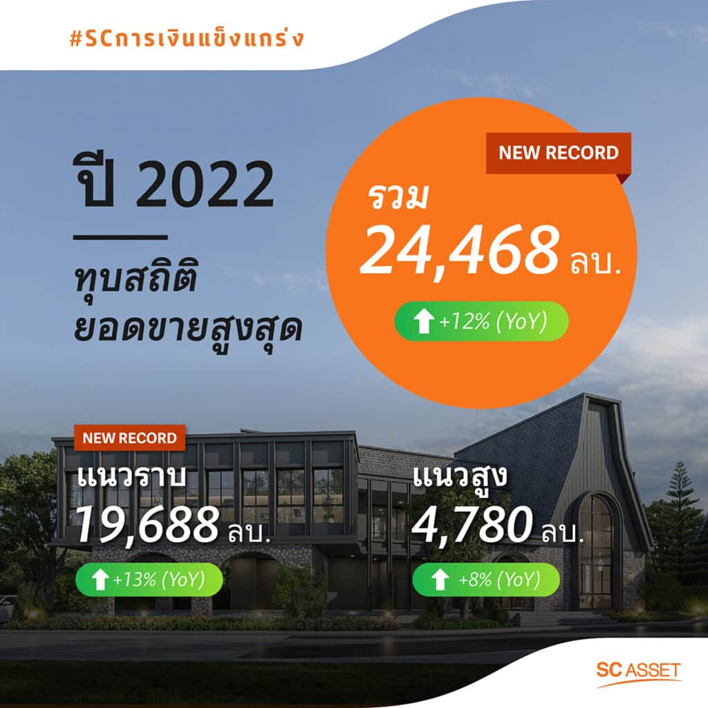 แม้ในปี 2022 ธุรกิจอสังหาริมทรัพย์จะได้รับผลกระทบจากสถานการณ์โควิด-19 แต่ บมจ.เอสซี แอสเสท คอร์ปอเรชั่น จำกัด หรือ SC ยังคงสร้างการเติบโตได้ตามเป้าหมายที่วางไว้ โดยกวาดยอดขายรวม ปี 2022 ทุบสถิติสูงสุด 24,468 ลบ. ส่วนแนวราบทะลุ 19,688 ล้านบาท หรือเติบโต 13%