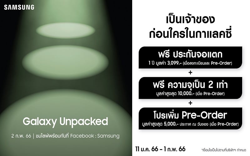ซัมซุง มีกำหนดเปิดตัวผลิตภัณฑ์ใหม่ของปี 2023 ภายในงาน Galaxy Unpacked ที่ทุกคนต่างรอคอย และซัมซุงได้เปิดลงทะเบียนความสนใจ The new Galaxy ล่วงหน้า ในครั้งนี้เฉพาะผู้ที่ลงทะเบียนรับสิทธิ์เท่านั้นจะได้รับ The new Galaxy ก่อนใคร เป็นเจ้าของและได้ใช้เป็นกลุ่มแรกของโลก พร้อมรับฟรีประกันจอแตก 1 ปี มูลค่า 3,099 บาท และ ฟรีความจุเพิ่มเป็น 2 เท่า มูลค่าสูงถึง 10,000 บาท นอกจากนี้ยังมีโปรโมชั่นเพิ่มที่จะประกาศ ณ วันเปิดจอง มูลค่าสูงสุด 5,000 บาท เมื่อนำโค้ดที่ได้จากการลงทะเบียนไปจองซื้อในช่วง Pre-Order