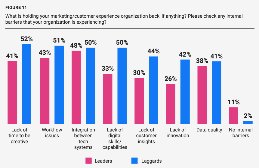 นอกจากนี้ พนักงานฝ่ายการตลาดเพียงหนึ่งในสาม (33%) ระบุว่าองค์กรของตนอยู่ในระดับที่ ‘ดี’ หรือ ‘ดีมาก’ ในเรื่องของการวางแผน การกำหนดขอบเขต การจัดลำดับความสำคัญ และการกำหนดคอนเทนต์เพื่อให้ได้ผลลัพธ์ที่เป็นรูปธรรม และ 43% ระบุว่าปัญหาเกี่ยวกับการจัดการเวิร์กโฟล์วเป็นอุปสรรคสำคัญที่ฉุดรั้งการดำเนินงานของฝ่ายการตลาด