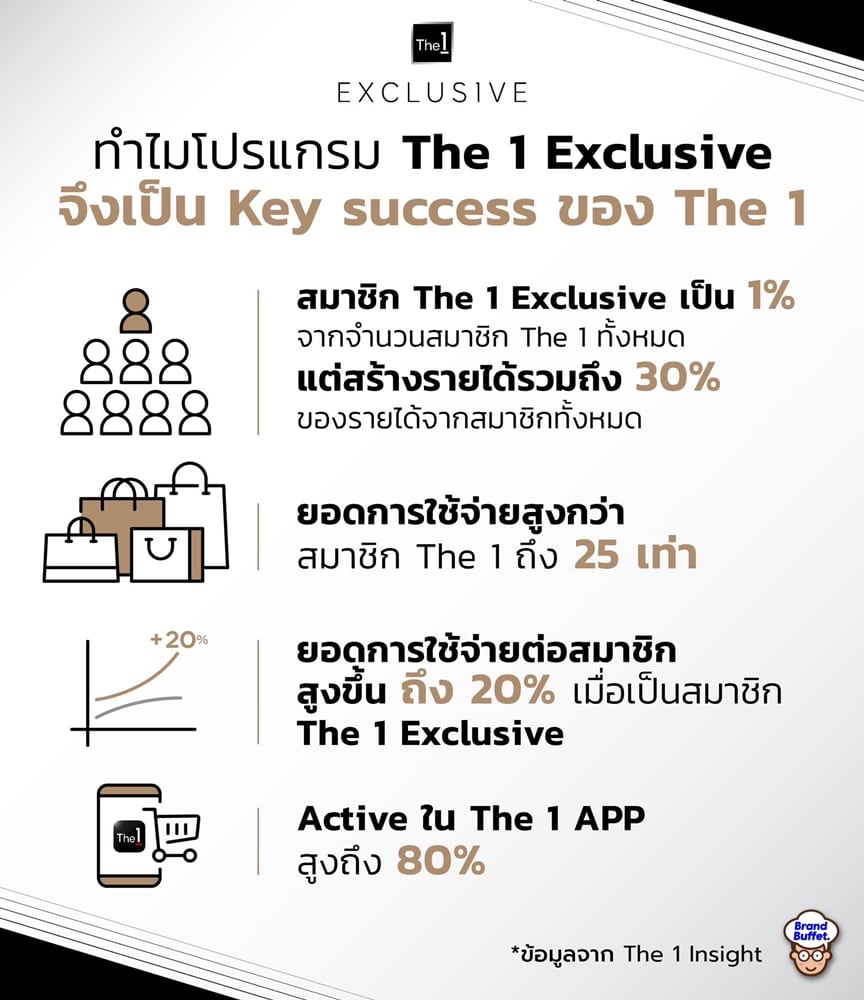 ด้วยข้อมูลจาก The 1 Insight สมาชิก The 1 Exclusive นั้นมีความสำคัญกับองค์กรในสัดส่วนที่มีนัยสำคัญอย่างมาก โดยแม้จำนวนสมาชิก The 1 Exclusive จะคิดเป็นสัดส่วนไม่ถึง 1% จากสมาชิก The 1 ทั้งหมด ทว่ากลับมียอดใช้จ่ายสูงกว่าสมาชิก The 1 ธรรมดากว่า 25 เท่า แถมยังสร้างยอดขายได้เป็นสัดส่วนกว่า 30% ของสมาชิกทั้งหมด ด้วยคุณค่าทางการตลาดของสมาชิก The 1 Exclusive ดังกล่าว เป้าหมายจึงไม่ใช่เพียงแค่สร้างการเข้าถึงสมาชิก แต่ยังหมายรวมถึงการมัดใจในระยะยาวที่อาศัยการสร้าง Brand Loyalty ให้ได้อีกด้วย