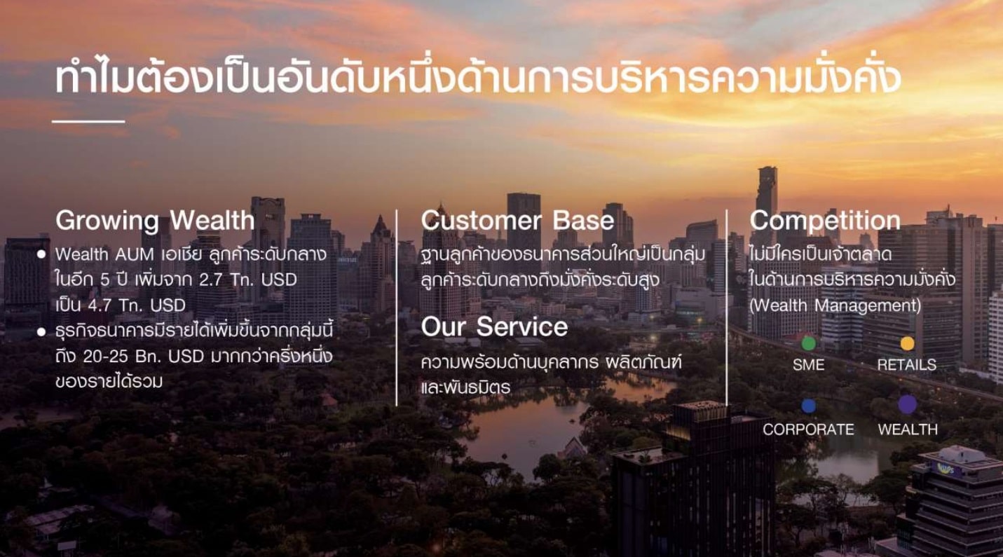 ปัจจุบัน SCB มีกลุ่มลูกค้าที่มีความมั่งคั่งเดิม ทั้ง HNW (High Net Worth) และ UHNW (Ultra High Net Worth) อยู่แล้ว แต่จากแนวโน้มการเติบโตกลุ่มชนชั้นกลางที่มีความมั่งคั่ง (Emerging Wealth) มากขึ้น จึงมีโอกาสสร้างการเติบโตในธุรกิจนี้ได้