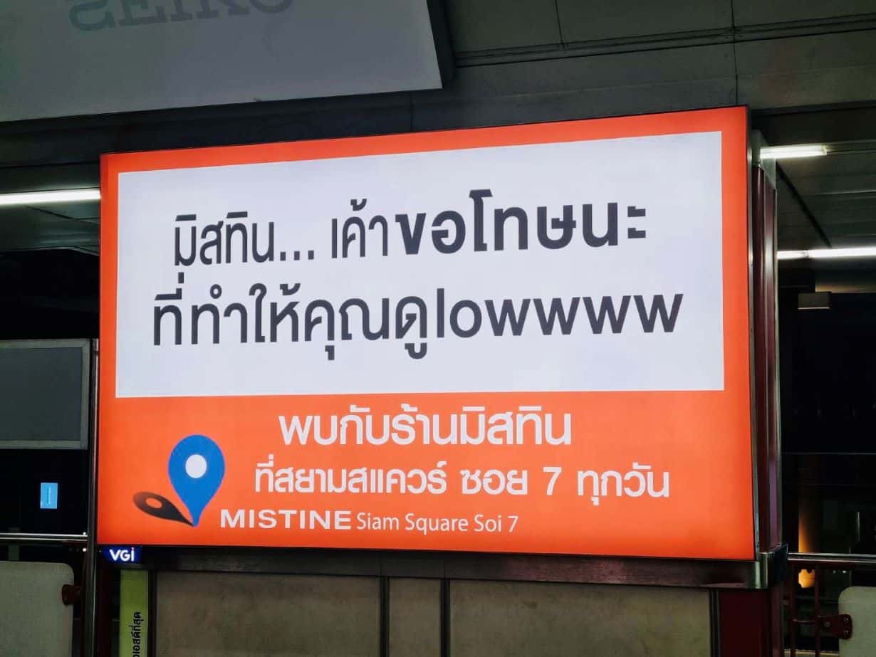 ไม่เพียงเท่านั้นยังอัดด้วยป้ายโฆษณาสื่อนอกบ้านต่าง ๆ ตามสถานีรถไฟฟ้า หรือ แยกสำคัญในกทม. ที่มีข้อความว่า “มิสทิน … เค้าขอโทษนะ ที่ทำให้คุณดู lowwww เพื่อตอกย้ำความแรงของแคมเปญนี้ให้กระจาย “ความจริงใจ” ในวงกว้างไปอีก
