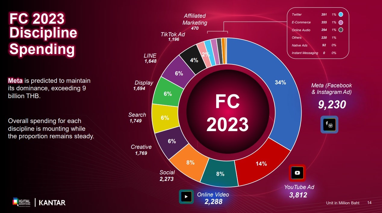 สมาคมโฆษณาดิจิทัล (ประเทศไทย) หรือ DAAT และคันทาร์ (ประเทศไทย) สรุปผลสำรวจมูลค่างบโฆษณาผ่านสื่อดิจิทัล ปี 2023 ไว้ดังนี้