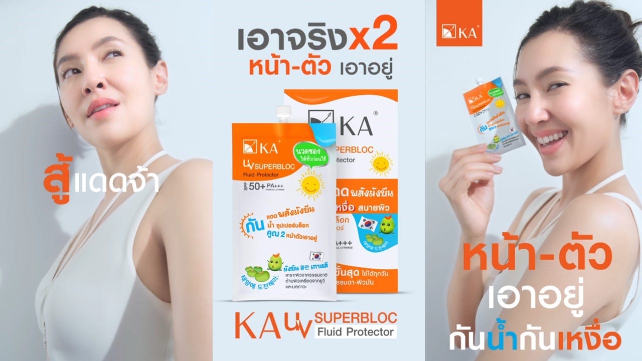 ขณะที่ KA UV SuperBloc Fluid Protector SPF50+ PA+++ ผลิตภัณฑ์กันแดดสูตรกันน้ำ ซุปเปอร์บล็อกแบบคูณสอง หน้า-ตัว เอาอยู่ อุดมด้วยสารสกัดมังบีน จากประเทศเกาหลี ทำหน้าที่เป็นเกราะผิวธรรมชาติต้านผิวเครียดจากแสงแดดจัด ใช้ได้ทั้งผิวหน้าและผิวกาย ช่วยบล็อกผิวจากรังสียูวีและมลภาวะต่าง ๆ เหมาะสำหรับคนที่เหงื่อออกง่าย ใช้ชีวิตอยู่กลางแดดเป็นเวลานาน เหมาะกับคนผิวธรรมดาและผิวมัน ให้สัมผัสเบา สบายผิว กันน้ำ กันเหงื่อ พร้อมบำรุงผิวให้คงความสดใสท้าแดดได้ตลอดวัน