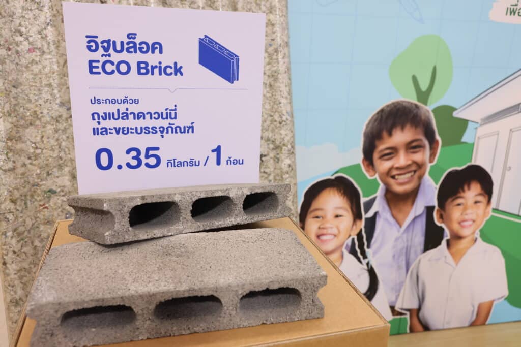 - อิฐบล็อค (ECO Brick) 1 ก้อน มีส่วนประกอบจากถุงเปล่าดาวน์นี่และขยะบรรจุภัณฑ์ปริมาณ 0.35 กิโลกรัม ตลอดทั้งโครงการวางแผนที่ใช้ประมาณ 1,800 ก้อน คิดเป็น 630 กิโลกรัม
