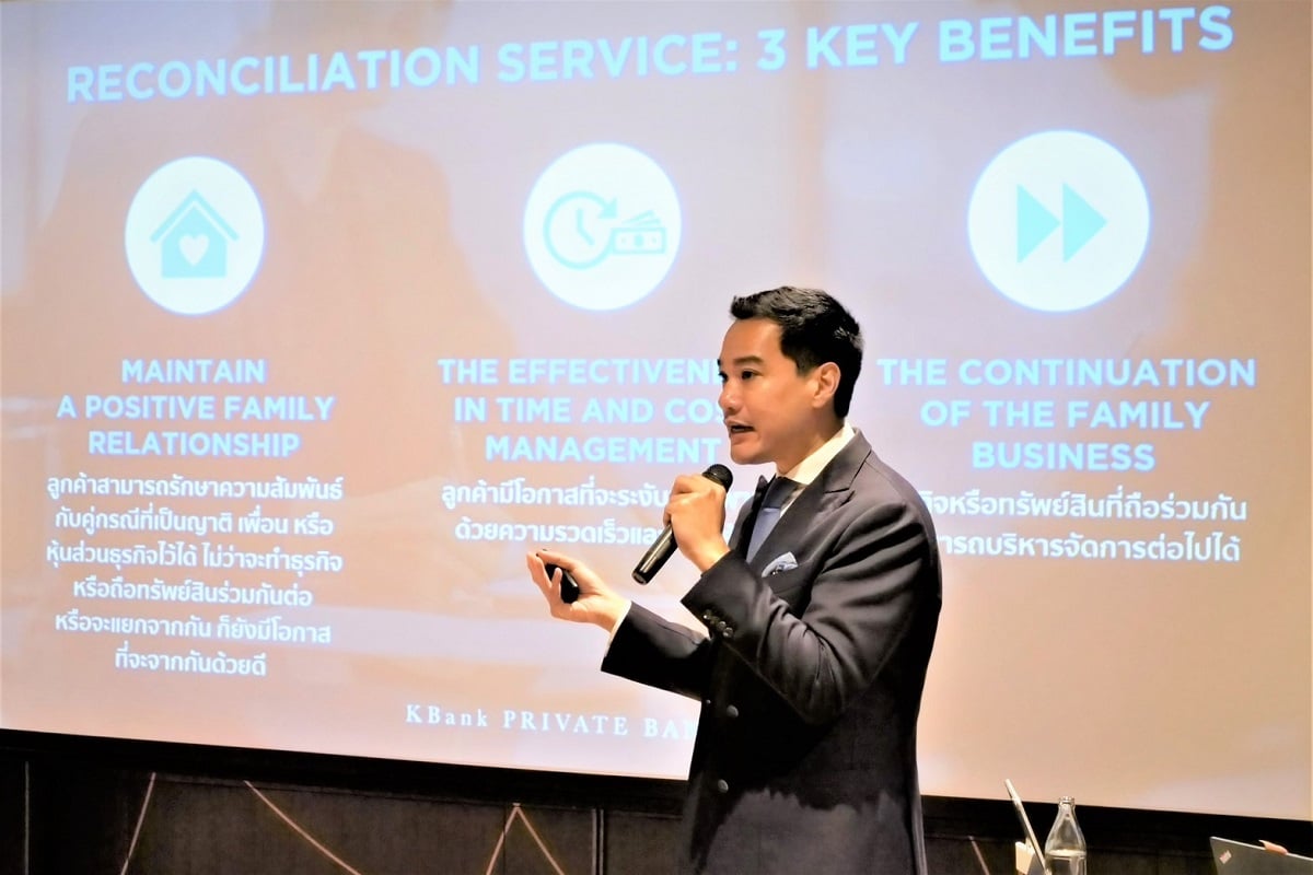 จากข้อมูลอินไซต์ของ KBank Private Banking ที่ปรึกษาด้านการบริหารทรัพย์สินครอบครัว พบว่า 15% ของลูกค้าที่ใช้บริการ ต้องเผชิญกับความขัดแย้งการจัดการธุรกิจครอบครัวและทรัพย์สินกงสี จึงเห็นโอกาสเปิดบริการใหม่ “Reconciliation Service” หรือบริการแก้ไขความขัดแย้งของครอบครัว เพื่อช่วยไกล่เกลี่ยข้อพิพาทและยุติปมความขัดแย้งในครอบครัว