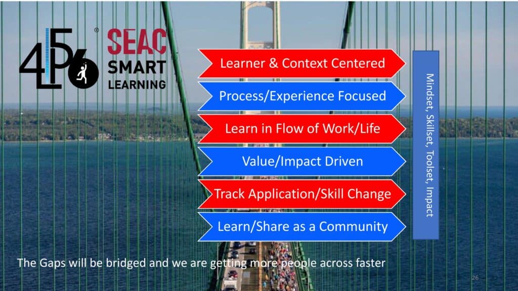 ด้านมิสเตอร์ เจมส์ เอนเกล (James R. Engel) Chief Learning Architect, SEAC ได้เน้นย้ำหัวใจในการออกแบบ และสร้างการเรียนรู้ที่นำไปสู่ผลลัพธ์การปรับใช้ได้จริงว่า “ที่ผ่านมา SEAC มีผู้เข้าร่วมอบรมกว่า 2 ล้านคน สร้างอัตราความสำเร็จหลักสูตรได้ถึง 77% และ 95% ของผู้เรียนกล่าวว่าสามารถนำความรู้ และทักษะออกไปใช้สร้างความเปลี่ยนแปลงได้จริง ทั้งนี้ SEAC ยังคงมุ่งมั่นที่จะยกระดับคุณภาพชีวิตของผู้คนผ่านการเรียนรู้ที่นำไปปรับใช้ได้จริง (Empower Lives Through Learning) โดย SEAC’s Smart Learning จะเป็นโซลูชั่นที่อำนวยความสะดวกให้ผู้เรียนสามารถสร้างความเปลี่ยนแปลงในเชิงบวกตั้งแต่ฐานรากของชีวิต ไปจนถึงระดับองค์กรได้ โดยมีตัวชี้วัดเป็น 6 องค์ประกอบสำคัญ ได้แก่