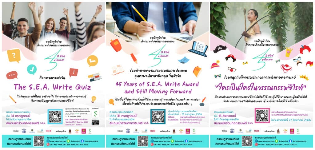 - การประกวดสุนทรพจน์ ภาษาอังกฤษ หัวข้อ Moving Forward : 45 Year of the S.E.A. Write Award เพื่อส่งเสริมให้นักอ่านและผู้สนใจในวรรณกรรมรางวัลซีไรต์ แสดงความรู้และทรรศนะเกี่ยวกับรางวัลซีไรต์ ทั้งความประทับใจที่มีต่อวรรณกรรมซีไรต์และการก้าวต่อไปของรางวัลซีไรต์ จากความคิดและมุมมองของนักอ่าน โดยหัวข้อการประกวดรอบที่ 1 คือ “ความประทับใจในหนังสือซีไรต์” ผู้เข้าประกวดต้องส่งเป็นคลิปวีดีโอความยาว 3-4 นาที ผ่านทาง E-mail: marketing@siamclmt.com พร้อมระบุหัวเรื่อง “ส่งผลงานเข้าร่วมกิจกรรม 45 ปีซีไรต์ (สุนทรพจน์)” ภายในวันที่ 31 กรกฎาคม 2566 ส่วนหัวข้อการประกวดรอบที่ 2 คือ “45 Years of S.E.A. Write Award and Still Moving Forward” ผู้เข้าประกวดต้องกล่าวสุนทรพจน์ความยาว 3 – 4 นาที ผ่านระบบออนไลน์ Zoom Meeting ในวันอาทิตย์ที่ 20 สิงหาคม 2566 และแข่งขันรอบตัดสิน 10 คนสุดท้าย ผู้เข้าประกวดต้องกล่าวสุนทรพจน์บนเวทีการจัดงานฯ ในวันที่ 27 สิงหาคม 2566 ผู้เข้าร่วมการประกวดสามารถค้นหารายละเอียดและติดตามผลการประกวดได้ที่เว็บไซต์ siamclmt.com ผู้สนใจสามารถสมัครได้ที่ https://forms.gle/rM3e64Gjh8cVbpJy6