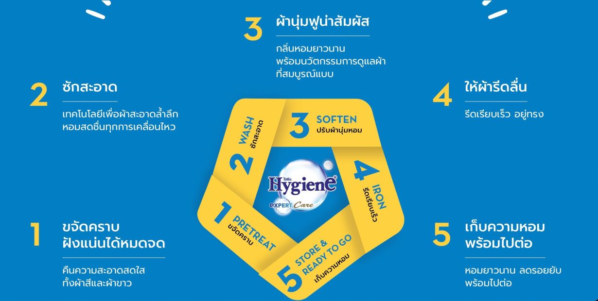 – ยืน 1 นวัตกรรมตอบสนองไลฟ์สไตล์ที่ไม่สิ้นสุด : ผ่านการพัฒนาผลิตภัณฑ์ใหม่ๆ ให้สามารถตอบโจทย์ผู้บริโภคได้อยู่เสมอ โดยเฉพาะการพัฒนาครั้งล่าสุด กับ “ไฮยีน เอ็กซ์เพิร์ท วอช สูตรป้องกันสีผ้าตกใส่” สะท้อนถึงความเข้าใจอินไซต์ผู้บริโภคที่ต้องการทั้งความมั่นใจ ความสะดวก และประหยัดเวลา ทำให้สามารถซักผ้าได้สะอาด หอมสดชื่น โดยไม่ต้องกังวลกับการแยกผ้าสีและผ้าขาวอีกต่อไป