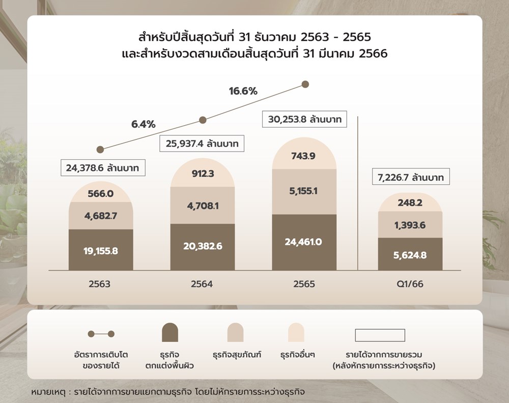 และเป็นที่น่าสนใจว่า รายได้ของ SCG Decor ยังคงเติบโตขึ้นต่อเนื่องจากปริมาณการขายที่เพิ่มขึ้นตามความต้องการของตลาด โดยปี 2565 รายได้ส่วนใหญ่มาจากธุรกิจตกแต่งพื้นผิวในไทย เวียดนาม ฟิลิปปินส์ และอินโดนีเซีย และมีรายได้ที่สูงขึ้นจากธุรกิจสุขภัณฑ์ด้วย