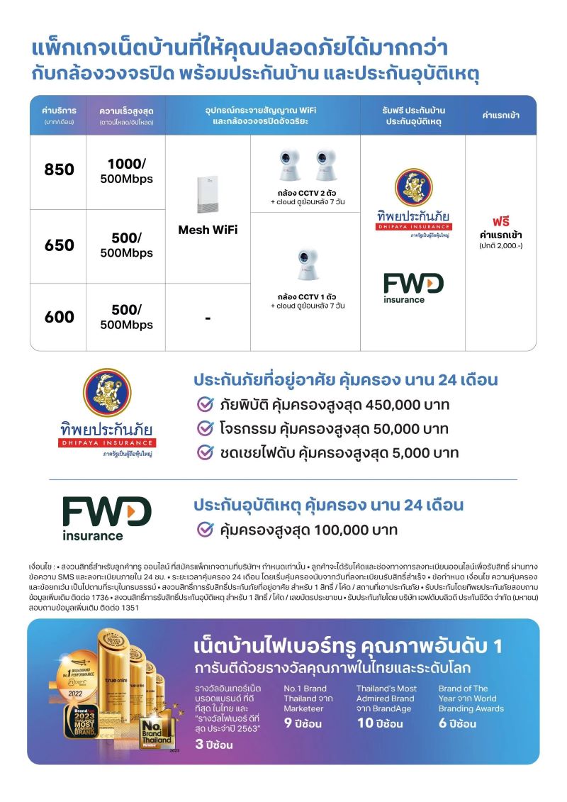 รับฟรี! ประกันภัยที่อยู่อาศัย นาน 12 เดือน กดรับสิทธิ์ได้ที่แอปพลิเคชั่น TrueX 10,000 สิทธิ์เท่านั้น หรือสมัครแพ็กเกจกล้อง CCTV พร้อม Cloud Service ดูภาพย้อนหลังได้ 7 วัน เพียงเดือนละ 120 บาท รับฟรี! ประกันภัยที่อยู่อาศัย นาน 24 เดือน