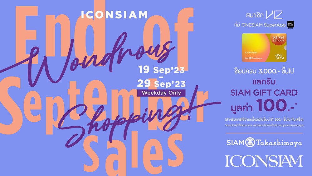 ไอคอนสยาม จัดแคมเปญโปรโมชั่น “ICONSIAM WONDROUS SHOPPING: End of September Sales!” ชวนเหล่านักช้อปยิ้มสู้โปรร้อนเดือนกันยายน เพียงมาเลือกซื้อสินค้าและบริการต่างๆ ภายในไอคอนสยาม และสยาม ทาคาชิมายะ (เฉพาะวันจันทร์ – ศุกร์) และมียอดซื้อครบตามกำหนด สามารถแลกรับ SIAM GIFT CARD มูลค่ารวมกว่า 2.7 แสนบาท