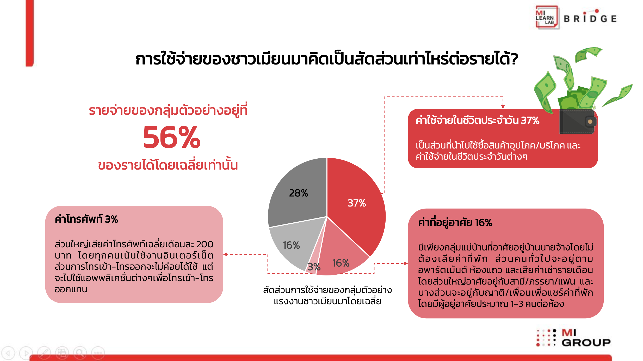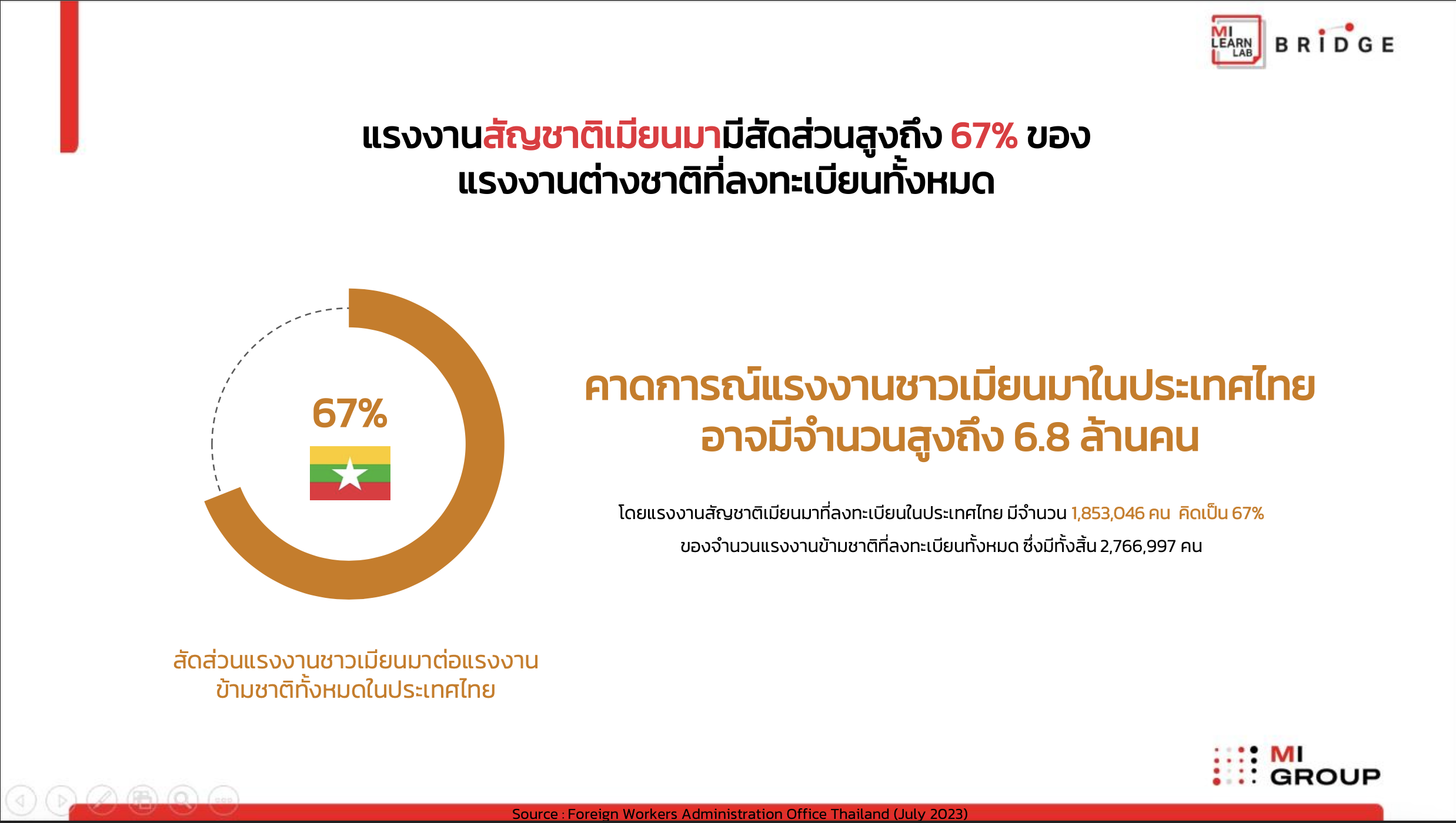 เพื่อทำความเข้าใจพฤติกรรมชาวเมียนมาในไทย MI GROUP โดยหน่วยงาน MI BRIDGE ร่วมมือกับ MI Learn Lab จัดทำวิจัยล่าสุดเจาะลึกข้อมูลแรงงานชาวเมียนมา ในหัวข้อ “ผ่าขุมทรัพย์แรงงานชาวเมียนมาในประเทศไทย” สรุปได้ดังนี้